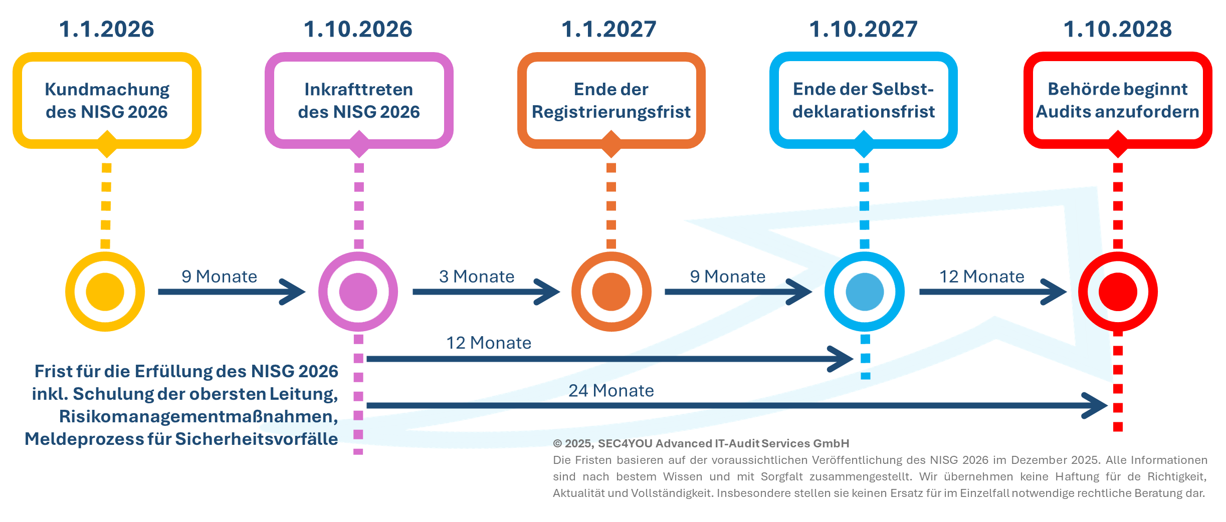 Wir empfehlen möglichst rasch mit der NIS2 Umsetzung zu beginnen, im Artikel erfahren Sie die kommenden Fristen und unseren 12 Punkteplan für die Umsetzung.