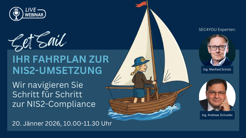Unsere Pia segelt am 20 Jänner 2026 gemeinsam mit Manfred Scholz und Andreas Schuster los und zeigt im Live-Webinar wie ein klarer Fahrplan für NIS2 aussehen kann und wie Sie in wenigen Monaten die NIS2 Anforderungen erfolgreich umsetzen können.