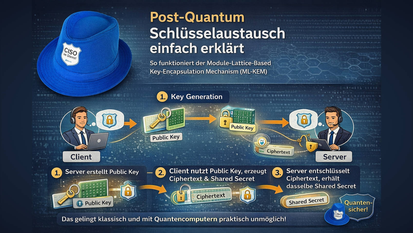 Der Module-Lattice-Based Key-Encapsulation Mechanism (ML-KEM) ist der von NIST standardisierte Post-Quanten-Schlüsselaustausch (basierend auf CRYSTALS-Kyber). Der Schlüsselaustausch ermöglicht es zwei Parteien sicher auf ein gemeinsames Geheimnis (in der Regel einen symmetrischen Schlüssel) zu einigen – auch wenn Quantencomputer den Netzwerkverkehr überwachen.